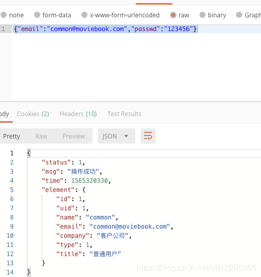 # {'status': 1, 'msg': '操作成功', 'time': 1565317698, 'element': {'id': 1, 'uid': 1, 'name': 'common', 'email': 'common@moviebook.com', 'company': '客户公司', 'type': 1, 'title': '普通用户'}}