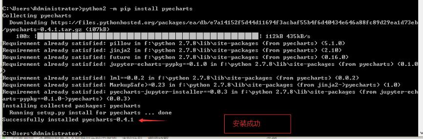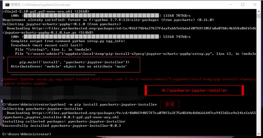这个不难理解,缺少pyecharts-jupyter-installer嘛,那就安一个呗。可能有人注意到,我使用的是python2 -m pip ...(这种写法是为了解决python 2和3共存时pip的冲突问题,具体解释在本页最后。)