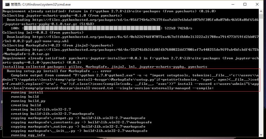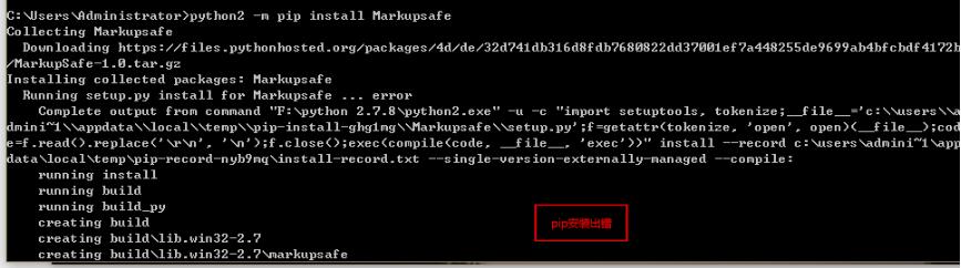 看到这个,很明显是安装MarkupSafe时出错了,但后面的 F:python 2.7.8....-u -c"import setuptools.....,我不得不说一句-'请原谅我水平低'...而去网上搜了半天,没几篇符合的,有一篇倒是解决了,却是linux环境,看来只能自己'摸黑过河了'...