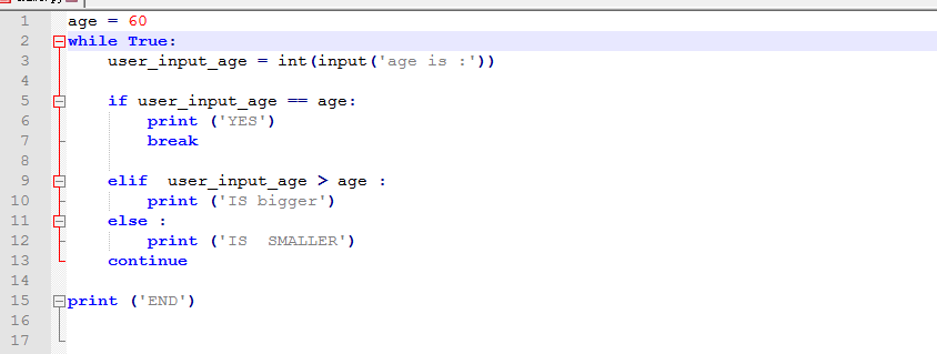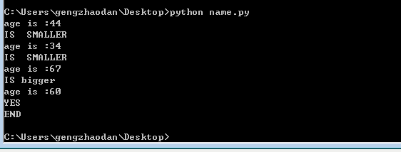 这是一个猜年龄的游戏,意思就是,当你猜到输入的年龄是60的时候,终止循环,如果你输入的年龄大于60,提示太大了,如果小于60,提示太小了。我们来逐个看下,每一段代码的意思。首先,我们定义变量,age年龄是60岁。定义它,是为了接下来要猜测年龄做准备。while True :这个意思是无限循环。这个的用法是,如果你所需的条件,等于你所输出的条件是正确的时候,就break,终止循环,否则就是无限循环。(是不是还不太懂,没关系,这个就记住是无限循环的意思。往后看就明白了。)接下来的这一段,user_input_age = int(input('age is :'))意思就是,定义你要输如数字的变量,int,这个解释我在上一章讲过,就是把字符串变成数据时使用。简单理解,就是你要输出的数字。if 判断,如果,user_input_age输入的数字,等于你定义的年龄60的时候,那就打印出来yes,那这个条件就是为真。是正确的,真实的,那么就break,终止循环。elif,再如果,user_input_age> age:这句话意思就是,如果你输出的年龄大于定义的年龄60的时候,那就打印出,太大了。else,其它的,就是小于60的,那就是输出太小了。注意,else,是当while循环后执行,只在break时不执行。意思就是说如果你加了break ,那就终止了,不会再执行了。那么continue的意思呢,跳过当次循环,继续循环的意思。如果你不加continue,就会无限循环,结果就跟上面的111111一样,无限循环你输入的年龄。然后print(‘'END‘')结束。我们来看下这段代码执行的结果: