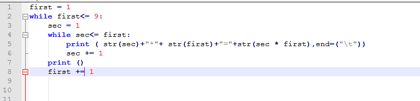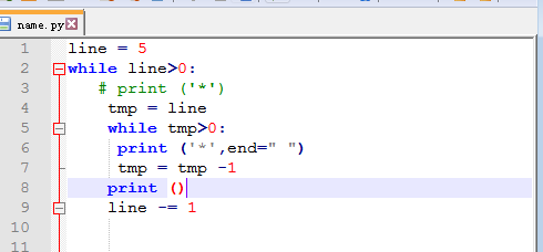 上面只是简单介绍了嵌套循环的用法,我们可以升级一下,利用*星号键,来组一个倒三角形。我们看下代码,然后解释一下: