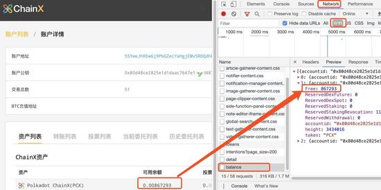 PCX区块浏览器地址为https://scan.chainx.org/,输入钱包地址之后就可以获得账户详情,怎么用程序获得余额呢?