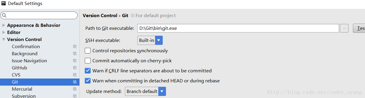 FileàDefault Settingà Version Controlà Git