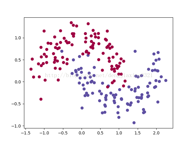 import numpy as np from sklearn.datasets import make_moons import matplotlib.pyplot as plt # 手动生成一个随机的平面点分布,并画出来 np.random.seed(0) X, y = make_moons(200, noise=0.20) plt.scatter(X[:,0], X[:,1], s=40, c=y, cmap=plt.cm.Spectral) plt.show()