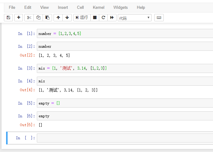 首先我们来讲一下列表的创建,创建列表使用[],如果创建一个空的列表,直接用[]表示即可。由下图我们可以看到,创建的列表对于数据格式没有限制,可以存放字符串、数值、甚至是列表。