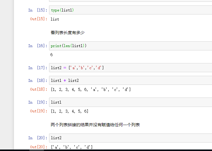 我们可以使用type()方法查看变量的类型,可以看到创建的是列表,我们使用len()函数来获取列表的长度。向列表中添加数据的方法,我们可以直接使用+号将两个列表拼接到一块。