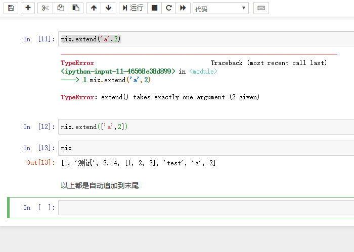 我们也可以使用append()方法,向列表的末尾添加某一个元素,但是我们不能 ,添加多个元素,否则会报错。我们可以使用另一个extend()方法,可以添加多个元素在列表的末尾,但是注意多个元素也必须要放在列表中,否则会报错。