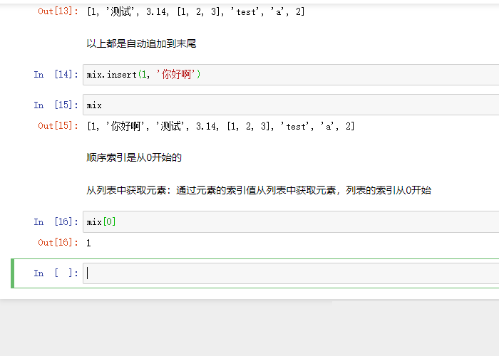 我们还可以给列表的指定位置添加值,我们使用insert()方法,因为列表的索引是从0开始的,我们插入数据到索引1实际是第二个元素。我们也可以通过索引来获取列表中的元素,例如mix[0]获取的是列表中第一个元素。