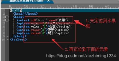 <html1> <head></head> <body> <select id="fruit" name="水果" style="width:100px;"> <option value ="0">苹果</option> <option value ="1">香蕉</option> <option value="2">菠萝</option> <option value="3">梨子</option> </body> </select>