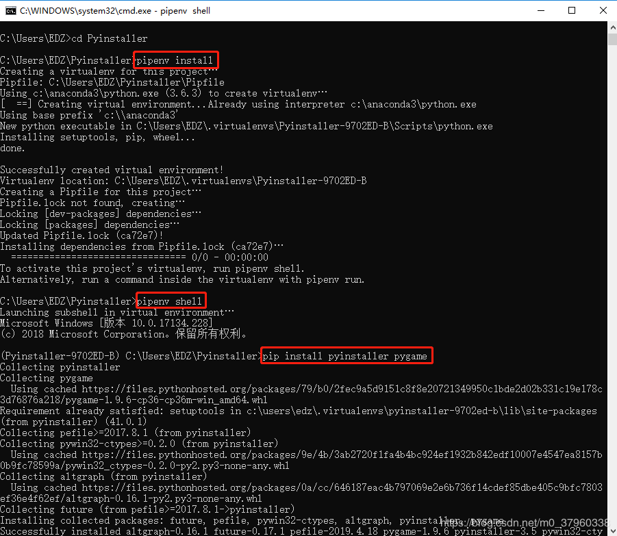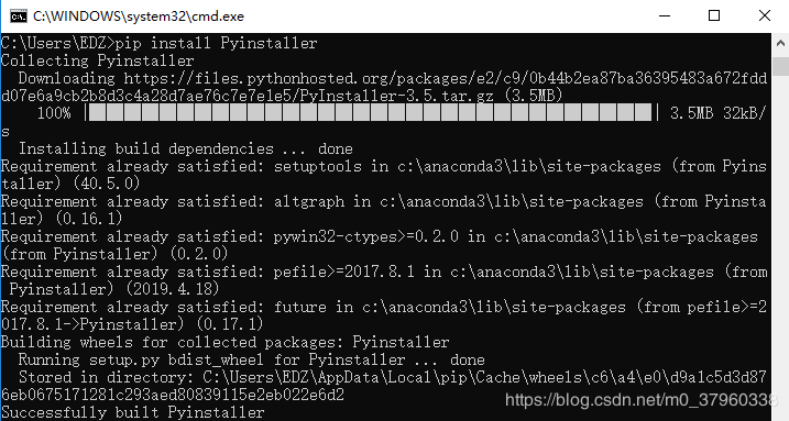 本人在C:/Users/EDZ/目录中新建Pyinstaller文件,首先进入目录,建立虚拟环境,进入虚拟环境,最后安装程序所需的安装模块以及pyinstaller。具体过程如图所示: