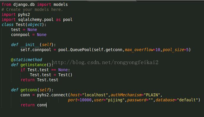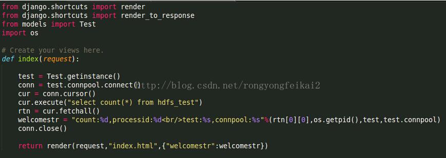 而views.py的index方法,则是调用Test的getinstance方法获得它的实例,同时用它的数据库连接池。