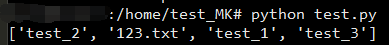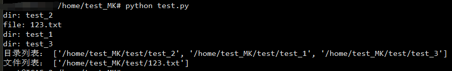 path="/home/test_MK/test" objects=os.listdir(path) dir_list=[] #存放目录列表 file_list=[] #存放文件列表 for obj in objects: if os.path.isdir(os.path.join(path, obj)):#判断是否是目录os.path.join()用来将路径拼接 dir_list.append(os.path.join(path, obj))#保存时保存完整路径才能对其进行后续操作 print "dir:",obj else: file_list.append(os.path.join(path, obj)) print "file:",obj print "目录列表:",dir_list print "文件列表:",file_list #如果项判断是否是文件时用os.isfile()