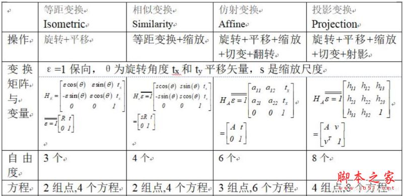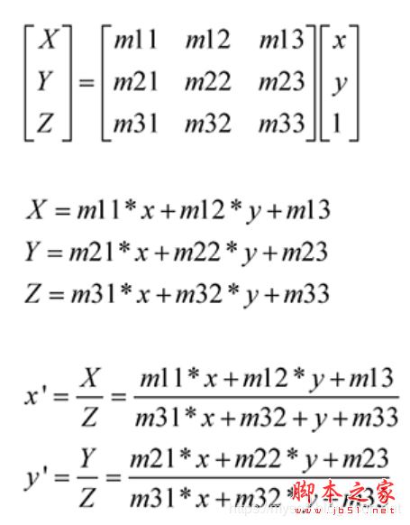投影变换的矩阵是8个未知数,所以要四组不同的坐标点才可以计算出来,与前面的矩阵比较一下: