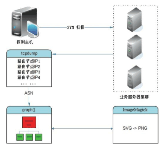 在此次实践中,通过scapy的traceroute()方法实现探测机到目标服务器的路由轨迹,整个过程的原理见下图,首先通过探测机以SYN方式进行TCP服务扫描,同时启动tcpdump进行抓包,捕获扫描过程经过的所有路由点,再通过graph()方法进行路由IP轨迹绘制,中间调用ASN映射查询IP地理信息并生成svg流程文档,最后使用ImageMagick工 具将svg格式转换成png,流程结束。