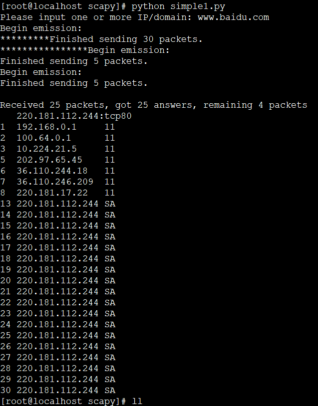 res,unans = traceroute(target,dport=dport,retry=-2) #启动路由跟踪