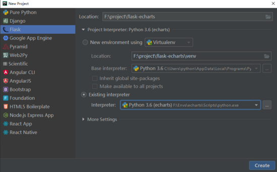 在编辑器中选择 New Project,然后选择 Flask,创建完之后,Pycharm 会帮我们把启动脚本和模板文件夹都建好