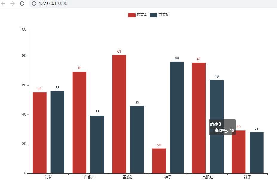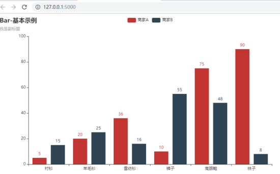 在 index 视图函数中接收浏览器传过来的参数,然后传递给 index.html。此处只是简单示例,所以未做参数校验。而另一个视图函数主要是获取参数,传给图表生成函数 bar_base(), 从而实现根据 url 地址传过来的参数,动态展示图表数据。结果如下: