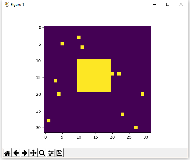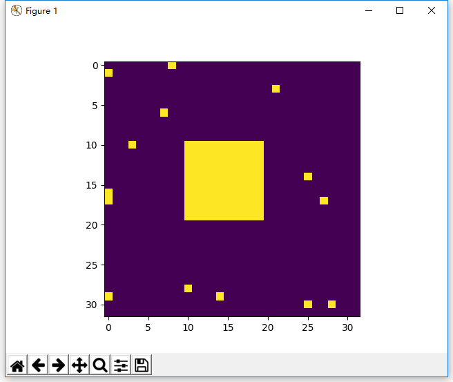 import numpy as np import matplotlib.pyplot as plt square = np.zeros((32,32))#全0数组 square[10:20,10:20]=1#把其中一部分设置为1 x, y =(32*np.random.random((2,15))).astype(np.int)#随机位置 square[x,y]=1#把随机位置设置为1 plt.imshow(square)#原始随机图像 plt.show()