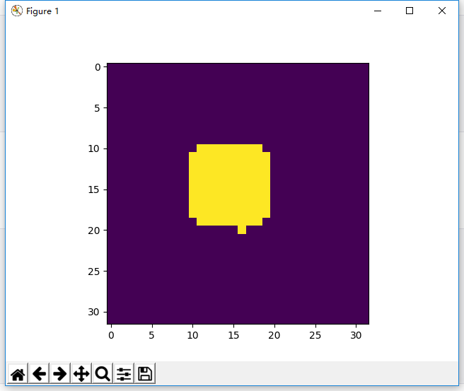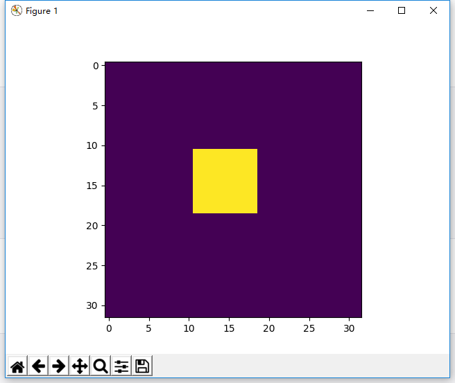 import numpy as np import matplotlib.pyplot as plt from scipy import ndimage square = np.zeros((32,32))#全0数组 square[10:20,10:20]=1#把其中一部分设置为1 x, y =(32*np.random.random((2,15))).astype(np.int)#随机位置 square[x,y]=1#把随机位置设置为1 closed_square = ndimage.binary_closing(square)#闭运算 plt.imshow(closed_square) plt.show()