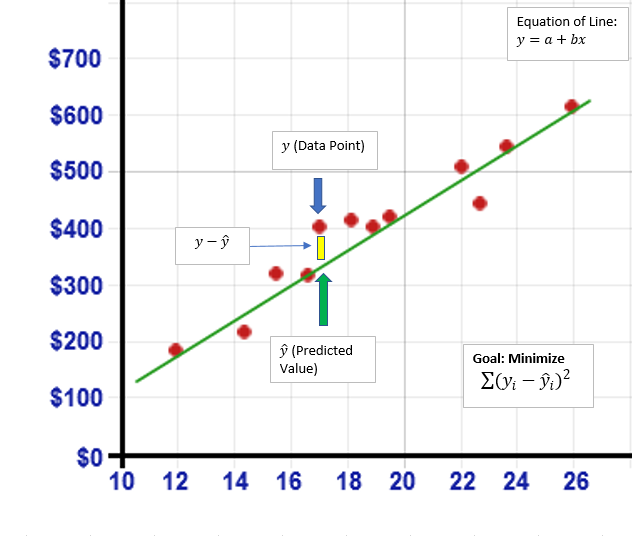 从本质上讲,这将构成我们对数据的最佳拟合。在OLS过程中通过数据集绘制了大量线条。该过程的目标是找到最佳拟合线,最小化平方误差和(SSE)与股票价格(y)的实际值以及我们在数据集中所有点的预测股票价格。这由下图表示。对于绘制的每条线,数据集中的每个点与模型输出的相应预测值之间存在差异。将这些差异中的每一个加起来并平方以产生平方和。从列表中,我们采用最小值导致我们的最佳匹配线。考虑下图: