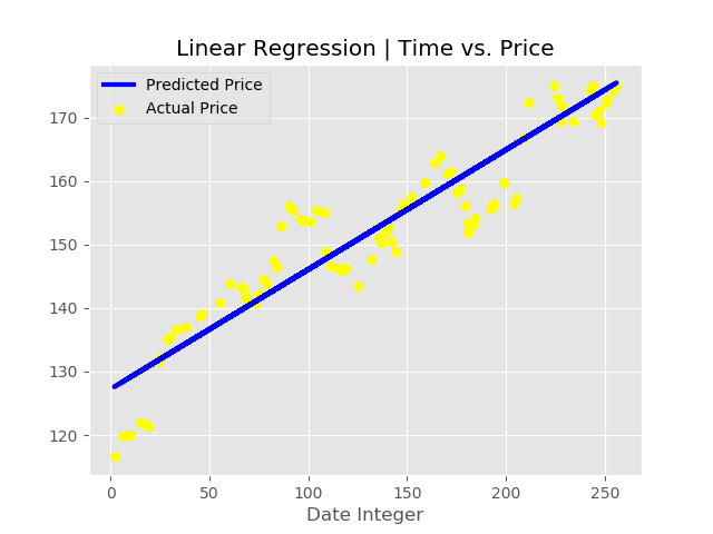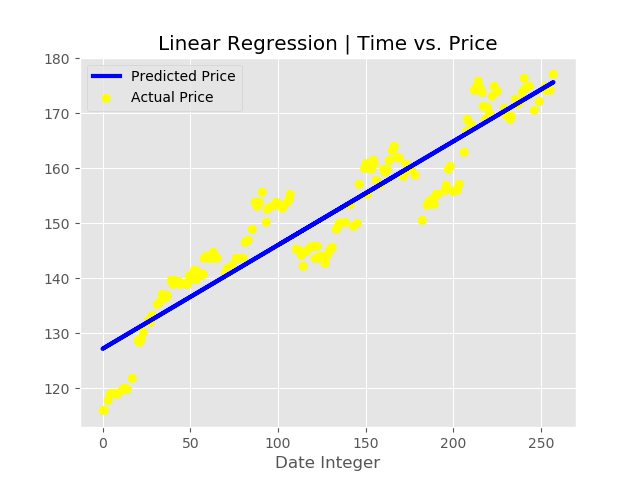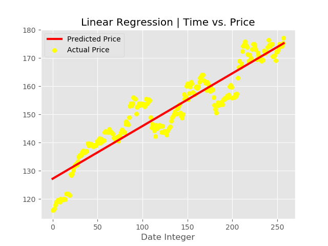 线性回归是一种用于模拟因变量(y)和自变量(x)之间关系的方法。通过简单的线性回归,只有一个自变量x。可能有许多独立变量属于多元线性回归的范畴。在这种情况下,我们只有一个自变量即日期。对于第一个日期上升到日期向量长度的整数,该日期将由1开始的整数表示,该日期可以根据时间序列数据而变化。当然,我们的因变量将是股票的价格。为了理解线性回归,您必须了解您可能在学校早期学到的相当基本的等式。