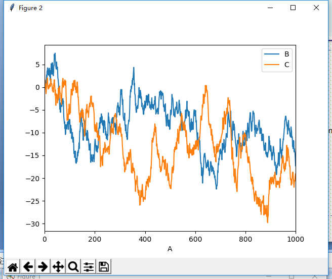 >>>import pandas as pd >>>import numpy as np >>>import matplotlib.pyplot as plt >>> df = pd.DataFrame(np.random.randn(1000,2), columns=['B','C']).cumsum() >>>print(df) B C 00.0898860.511081 11.3237661.584758 21.489479-0.438671 30.831331-0.398021 4-0.2482330.494418 5-0.0130850.684518 60.666951-1.422161 71.768838-0.658786 82.6610800.648505 91.9517510.836261 103.5387851.657475 113.2540342.052609 124.2486201.568401 134.0771730.055622 143.452590-0.200314 152.627620-0.408829 163.690537-0.210440 173.1849240.365447 183.646556-0.150044 194.164563-0.023405 202.3914470.517872 212.8651530.686649 223.6231830.663927 231.5451170.151044 243.5959240.903619 253.0138041.855083 264.4388011.014572 275.1552160.882628 284.4314570.741509 292.8419490.709991 ........ 970-7.910646-13.738689 971-7.318091-14.811335 972-9.144376-15.466873 973-9.538658-15.367167 974-9.061114-16.822726 975-9.803798-17.368350 976-10.180575-17.270180 977-10.601352-17.671543 978-10.804909-19.535919 979-10.397964-20.361419 980-10.979640-20.300267 981-8.738223-20.202669 982-9.339929-21.528973 983-9.780686-20.902152 984-11.072655-21.235735 985-10.849717-20.439201 986-10.953247-19.708973 987-13.032707-18.687553 988-12.984567-19.557132 989-13.508836-18.747584 990-13.420713-19.883180 991-11.718125-20.474092 992-11.936512-21.360752 993-14.225655-22.006776 994-13.524940-20.844519 995-14.088767-20.492952 996-14.169056-20.666777 997-14.798708-19.960555 998-15.766568-19.395622 999-17.281143-19.089793 [1000 rows x 2 columns] >>> df['A']= pd.Series(list(range(len(df)))) >>>print(df) B C A 00.0898860.5110810 11.3237661.5847581 21.489479-0.4386712 30.831331-0.3980213 4-0.2482330.4944184 5-0.0130850.6845185 60.666951-1.4221616 71.768838-0.6587867 82.6610800.6485058 91.9517510.8362619 103.5387851.65747510 113.2540342.05260911 124.2486201.56840112 134.0771730.05562213 143.452590-0.20031414 152.627620-0.40882915 163.690537-0.21044016 173.1849240.36544717 183.646556-0.15004418 194.164563-0.02340519 202.3914470.51787220 212.8651530.68664921 223.6231830.66392722 231.5451170.15104423 243.5959240.90361924 253.0138041.85508325 264.4388011.01457226 275.1552160.88262827 284.4314570.74150928 292.8419490.70999129 ........... 970-7.910646-13.738689970 971-7.318091-14.811335971 972-9.144376-15.466873972 973-9.538658-15.367167973 974-9.061114-16.822726974 975-9.803798-17.368350975 976-10.180575-17.270180976 977-10.601352-17.671543977 978-10.804909-19.535919978 979-10.397964-20.361419979 980-10.979640-20.300267980 981-8.738223-20.202669981 982-9.339929-21.528973982 983-9.780686-20.902152983 984-11.072655-21.235735984 985-10.849717-20.439201985 986-10.953247-19.708973986 987-13.032707-18.687553987 988-12.984567-19.557132988 989-13.508836-18.747584989 990-13.420713-19.883180990 991-11.718125-20.474092991 992-11.936512-21.360752992 993-14.225655-22.006776993 994-13.524940-20.844519994 995-14.088767-20.492952995 996-14.169056-20.666777996 997-14.798708-19.960555997 998-15.766568-19.395622998 999-17.281143-19.089793999 [1000 rows x 3 columns] >>> plt.figure() <matplotlib.figure.Figure object at 0x000002A2A0B10F28> >>> df.plot(x='A') <matplotlib.axes._subplots.AxesSubplot object at 0x000002A2A12FE7F0> >>> plt.show()