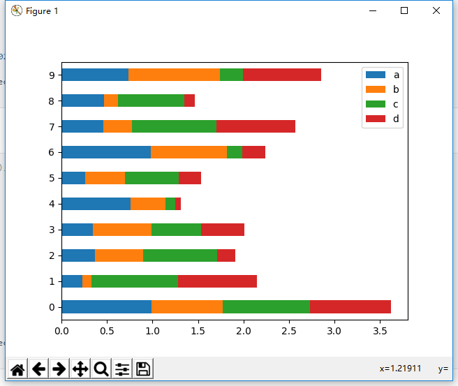 >>> df = pd.DataFrame(np.random.rand(10,4), columns=['a','b','c','d']) >>> df.plot(kind='barh', stacked=True) <matplotlib.axes._subplots.AxesSubplot object at 0x000002A2A3784390> >>> plt.show()