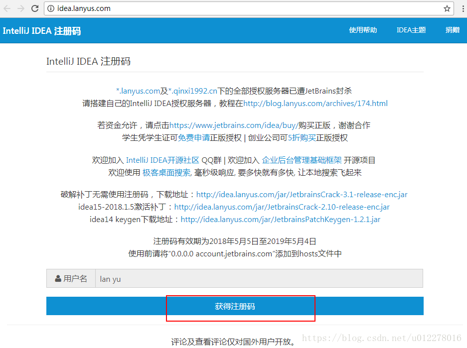 进入网站 http://idea.lanyus.com/ 获取注册码。