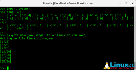 import pysynth # 例1:C大调 song1 = [ ['c',4],['d',4],['e',4],['f',4],['g',4],['a',4],['b',4],['c5',2],['r',1], ['c3',4],['d3',4],['e3',4],['f3',4],['g3',4],['a3',4],['b3',4],['c4',2],['r',1], ['c1*', 1], ['c2*', 1], ['c3*', 1], ['c4*', 1], ['c5*', 1], ['c6*', 1], ['c7*', 1], ['c8*', 1], ] pysynth.make_wav(song1, fn = "linuxidc.com.wav")