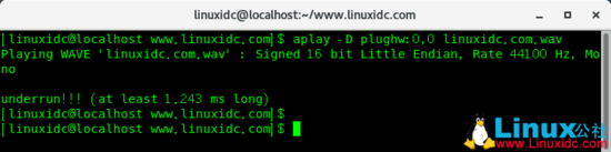 [linuxidc@localhost www.linuxidc.com]$ aplay -D plughw:0,0 linuxidc.com.wav