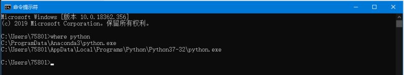启动cmd(命令行提示符),输入:where python 即可。下面看到,我的电脑上装了两个python,选择你常用的那个版本即可。