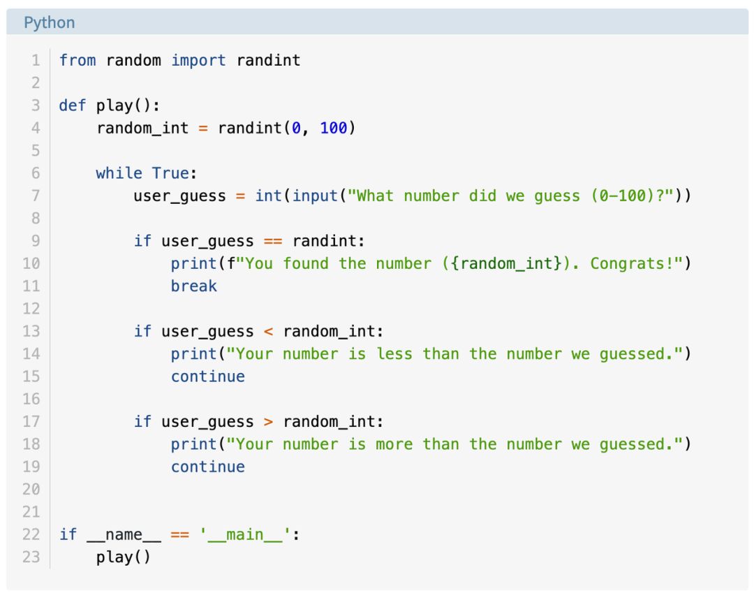 至于测试代码,我们来快速写一个简单的猜谜游戏,即程序选择一个数字让用户来猜,在每一次猜测时,程序将告诉用户他猜的数字比神秘数字大还是小,用户猜中数字时游戏结束。以下是该游戏的代码: