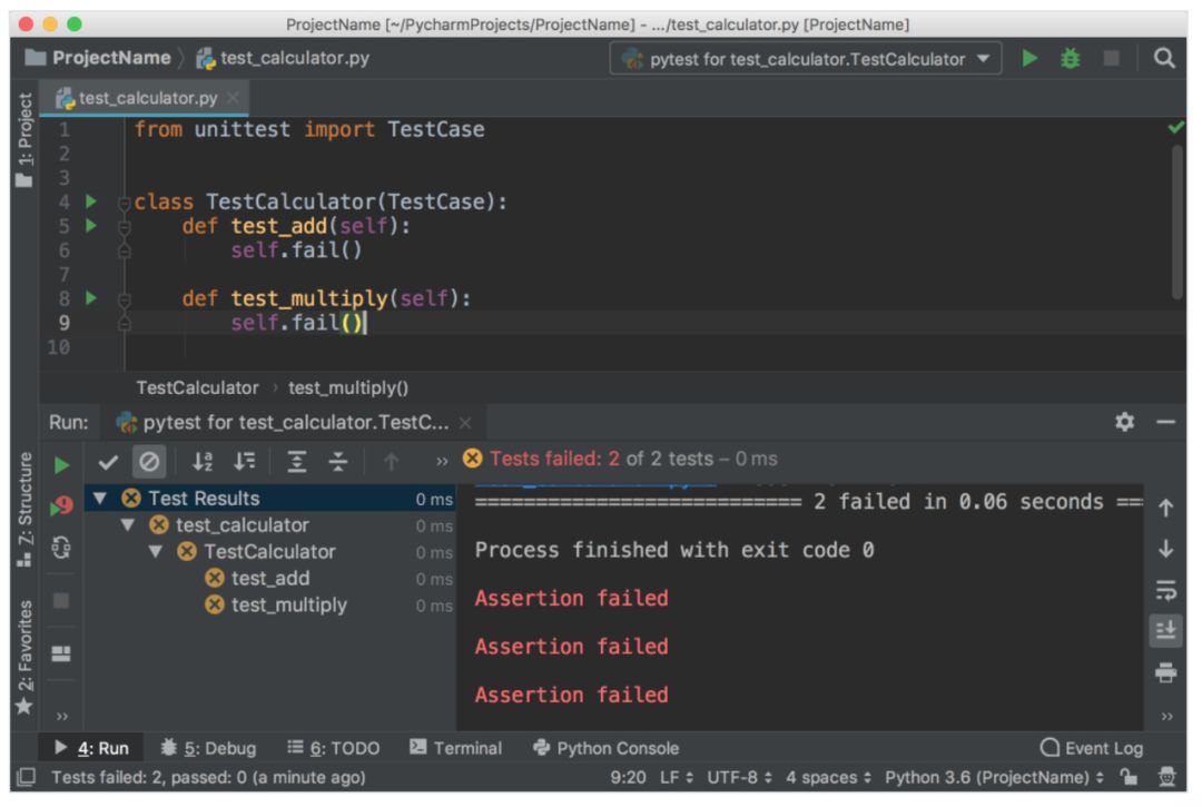 Target directory、Test file name 和 Test class name 这三项均保留默认设置。选中上图中两种需要测试的方法并点击 OK。好了!PyCharm 自动创建文件 test_calculator.py,并在其中创建了以下 stub test:
