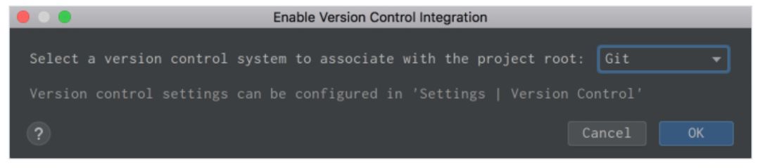 要想实现 VCS 集成,你需要在顶部菜单点击 VCS → VCS Operations Popup…,或者在 Mac 系统中使用 Ctrl+V 键,在 Windows 或 Linux 系统中使用 Alt+` 键。选择 Enable Version Control Integration…,你将看到以下窗口: