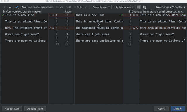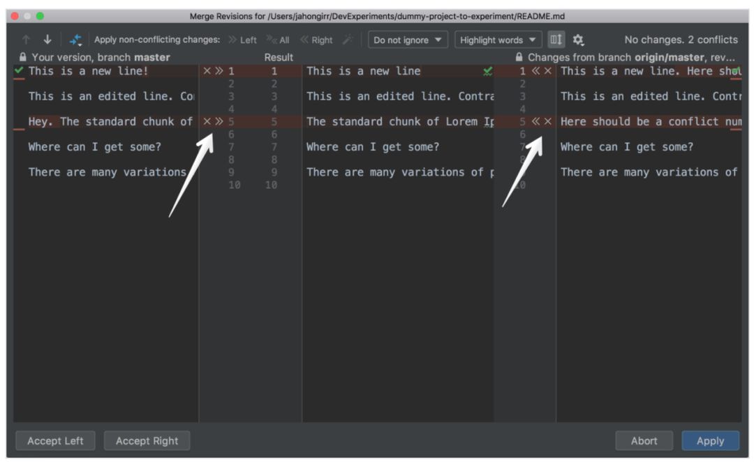 在左侧列中,你可以查看自己做的更改。在右侧列中,可以查看队友做的更改。而中间列则显示结果。存在冲突的代码行被高亮显示,你可以在它们旁边看到 X 和 >>/<<。点击箭头表示接受更改,点击 X 则表示拒绝更改。解决所有冲突后,点击 Apply 按钮: