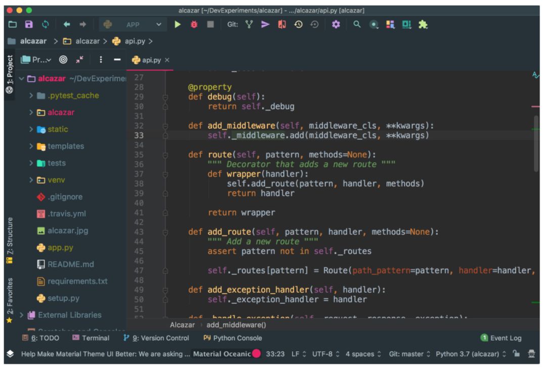 为了探索 PyCharm 以项目为中心的特征,你将使用 Alcazar web 框架(该框架用于学习目的)。在本地复制该 repo(地址:https://realpython.com/optins/view/alcazar-web-framework/)。