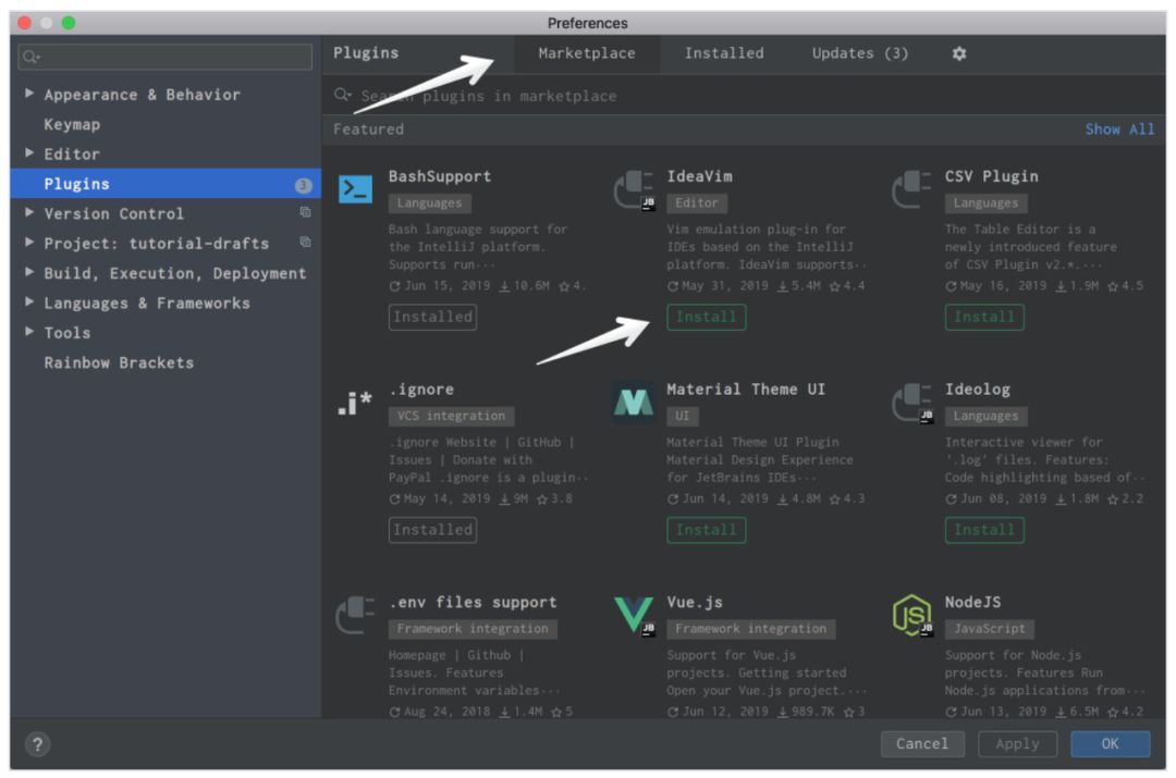 在 Mac 系统上点击 Preferences → Plugins,在 Windows 或 Linux 系统中点击 Settings → Plugins,你可以在 Marketplace 标签下找到和安装所有可用插件: