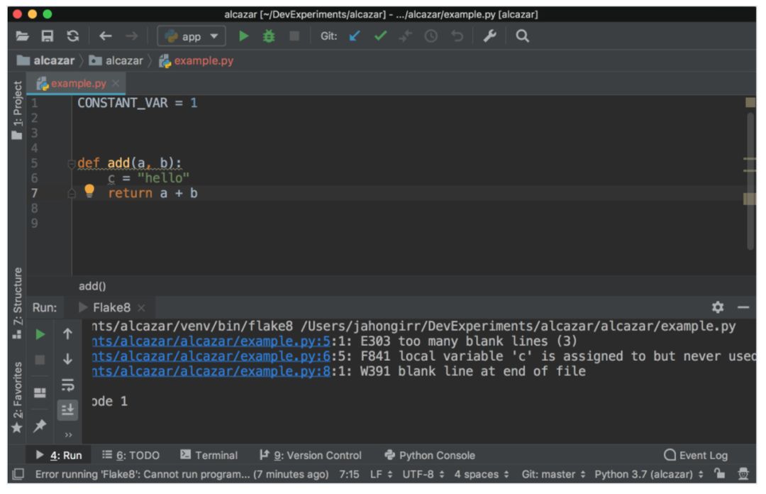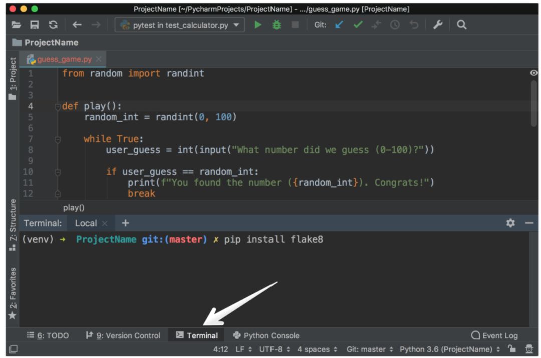 首先,在所选 Terminal app 中键入 pip install flake8,从而在虚拟环境中安装 Flake8。或者也可以使用 PyCharm 集成的 Terminal: