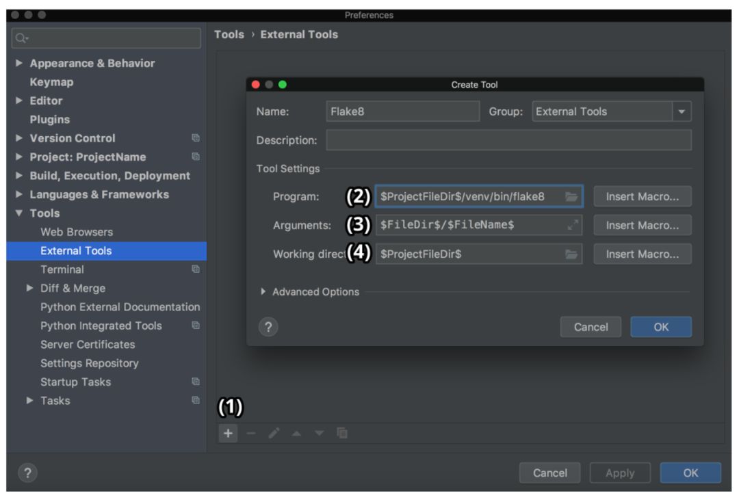 在 Mac 系统上点击 Preferences → Tools,在 Windows 或 Linux 系统中点击 Settings → Tools,选择 External Tools。然后点击底部 (1) 处的 + 按钮。在弹出的窗口中,输入细节并在两个窗口中点击 OK,如下图所示: