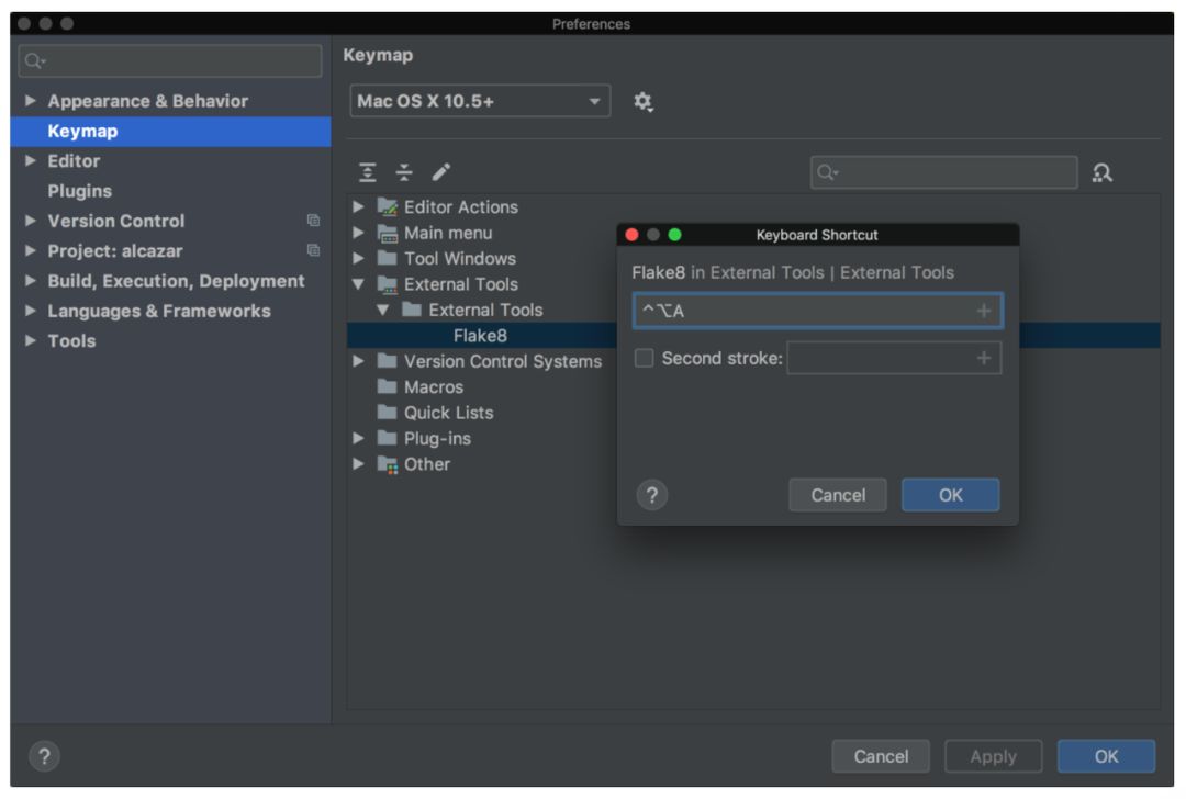 为了使效果更好,你可以为其添加快捷键。在 Mac 系统中选择 Preferences,在 Windows 或 Linux 系统中选择 Settings。然后,点击 Keymap → External Tools → External Tools。双击 Flake8,选择 Add Keyboard Shortcut,出现以下窗口: