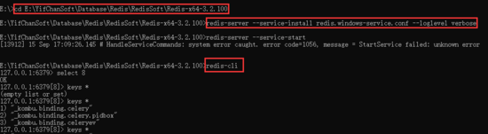 E:\>cd E:\YifChanSoft\Database\Redis\RedisSoft\Redis-x64-3.2.100 E:\YifChanSoft\Database\Redis\RedisSoft\Redis-x64-3.2.100>redis-server --service-install redis.windows-service.conf --loglevel verbose E:\YifChanSoft\Database\Redis\RedisSoft\Redis-x64-3.2.100>redis-cli 127.0.0.1:6379> select 8 OK 127.0.0.1:6379[8]> keys * (empty list or set) 127.0.0.1:6379[8]> keys * 1) "_kombu.binding.celery" 2) "_kombu.binding.celery.pidbox" 3) "_kombu.binding.celeryev"