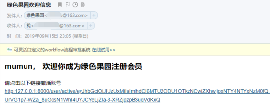 EMAIL_FROM = '绿色果园<发送邮件的邮箱>'