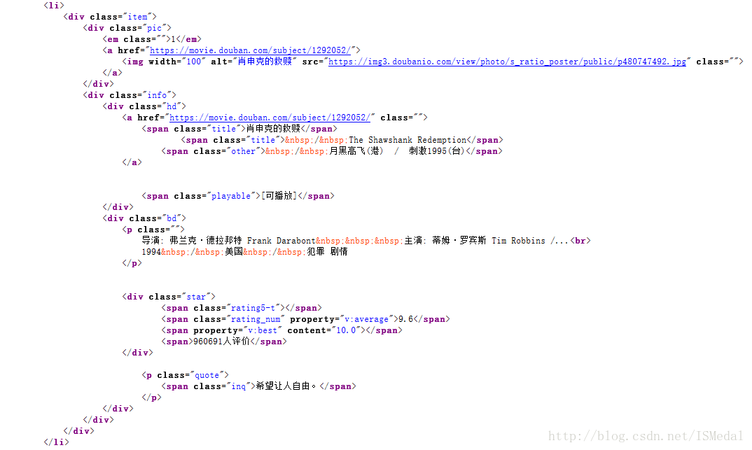 step2:做每一页的网址解析,打开原网址https://movie.douban.com/top250?,查看网页源代码,可以看到每一个电影的源代码都是从<li>开始,在</li>处结束,写好正则表达式以后爬到的列表的每一条item都有五个元素,因此将其写成字典的形式,这里用到yield函数(关于yield函数的用法,廖老师的有一篇文章比较好懂https://www.ibm.com/developerworks/cn/opensource/os-cn-python-yield/)
