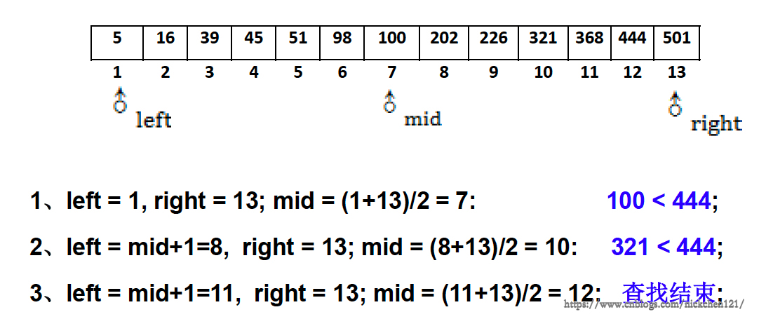 例:假设有13个数据元素,按关键字由小到大顺序存放。二分查找关键字为444的数据元素过程如下图: