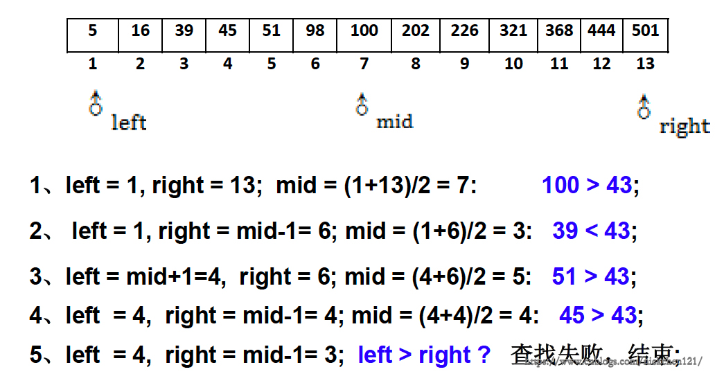 仍然以上面13个数据元素构成的有序线性表为例,二分查找关键字为43的数据元素如下图: