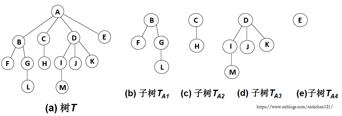 当n=0时,称为空树对于任一颗非空树(n>0),它具备以下性质: 树中有一个称为根(Root)的特殊结点,用r表示其余结点可分为m(m>0)个互不相交的有限集\(T_1,T_2,\cdots,T_m\),其中每个集合本身又是一棵树,称为原来树的子树(SubTree)
