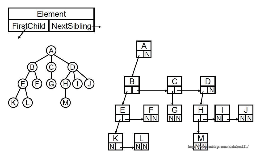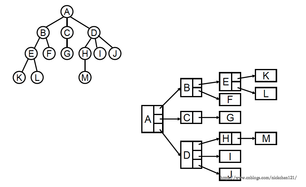 上图所示树的链表表示法有很大的缺陷,假设树的深度非常大,并且不能保证所有树的子结点都有3个,那么会造成很大程度的浪费。