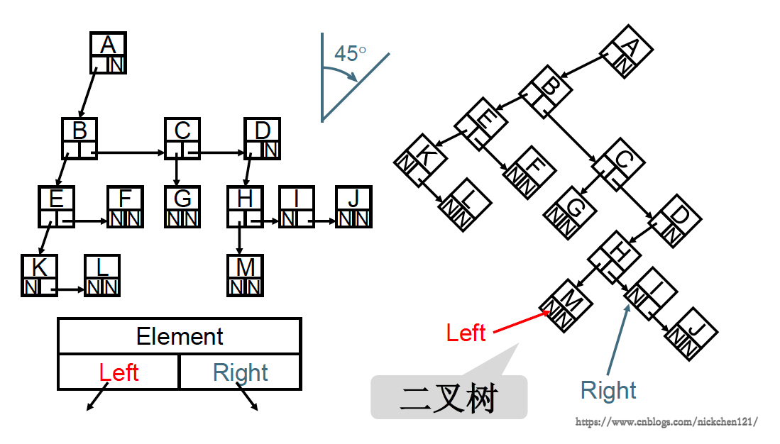 上图所示的树的表示方法,已经足够完美了,但是如果我们把链表表示的树旋转45°角,会发现如下图所示: