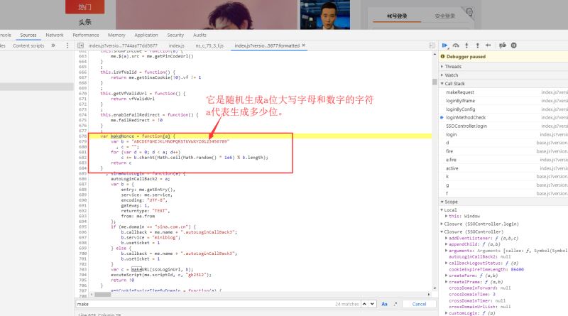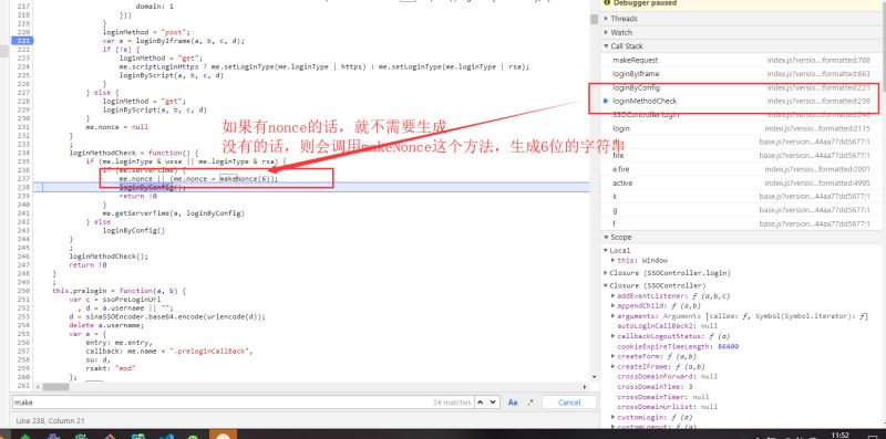 nonce:它呢也出现过在未点击登录前的那个请求响应的数据中,但是呢,我们点了几次登录,都未发现这个请求了。nonce的值每次还不一样。所以它肯定是本地js文件的某个函数生成,不用请求服务器获取。我们在这里找到了nonce的生成函数