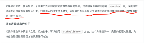 通过图三我们知道了 laravel 默认的是返回一个带 422 的 http 状态码并且将所有的验证错误信息都返回。